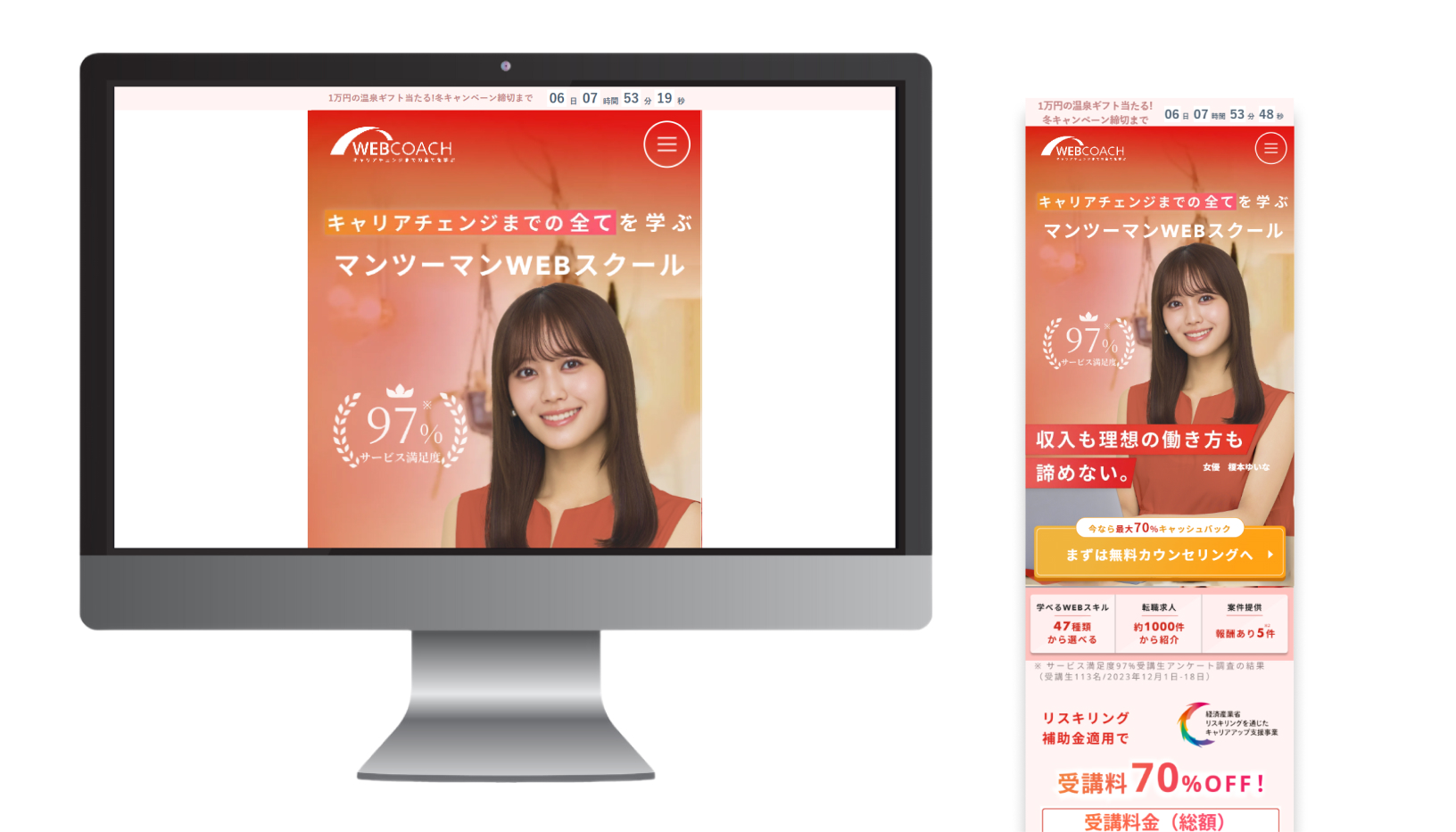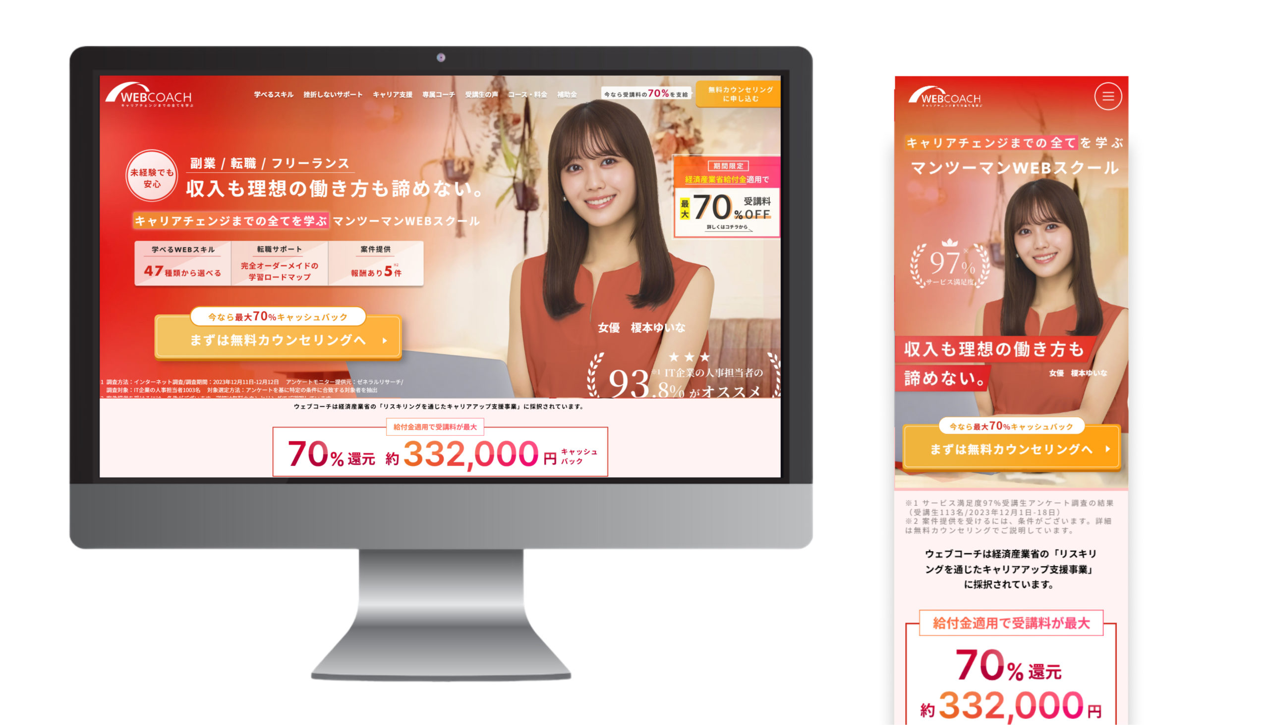 WEBCOACHは、キャリアチェンジまでの全てを学び理想の”収入を働き方”、どちらも叶えるためのマンツーマンWEBスクールです。